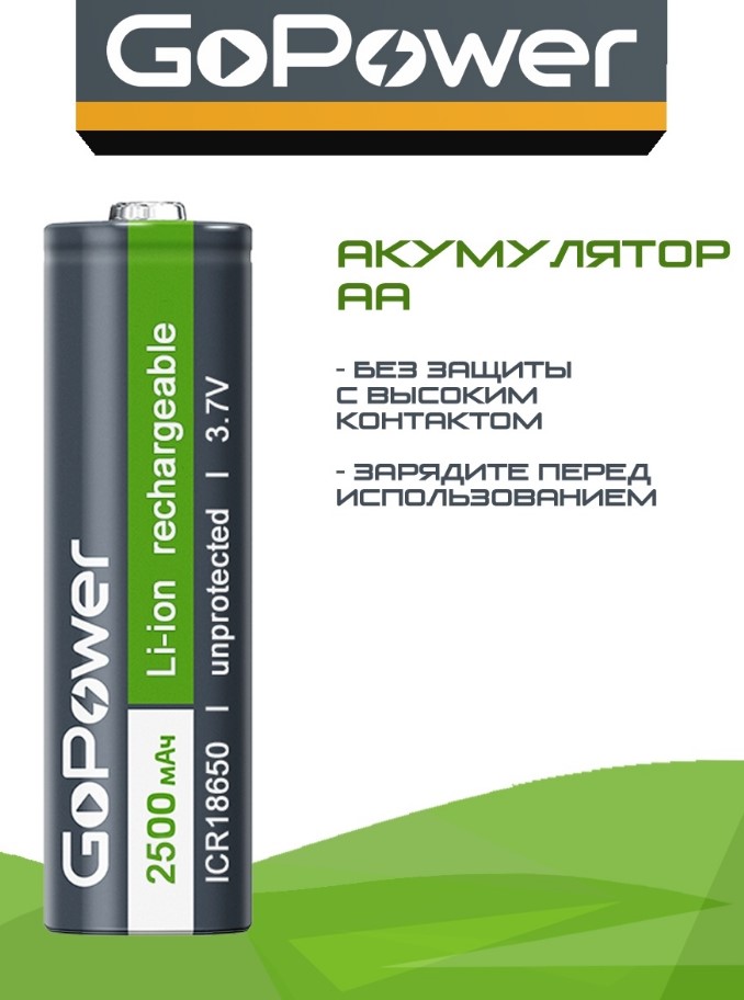 Аккумулятор Li-ion 18650 2500мАч GoPower 1xBL 3.7V без защиты выс.конт. (6/120)