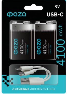 Аккумулятор Li-ion 6LR61 4100мАч Фаzа 2xBL USB-C +кабель (20)