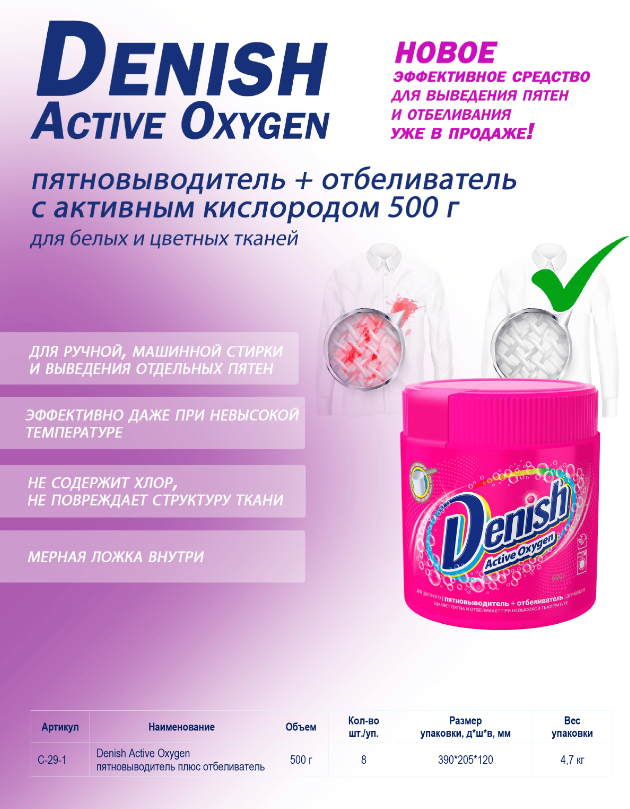 Интернет-магазин «Витрина 59» предлагает купить товар «Отбеливатель пятновыводитель 500г Denish Active Oxygen (8) акция» по цене: 24 529.00 руб. Артикул товара - С-29-1. Вы можете оформить заказ через интернет-магазин или по телефону +7 (950) 45-67-67-6. Дополнительную информацию о продаже товаров из каталога «Бытовая химия и средства ухода» вы можете получить у нашего менеджера. Звоните!