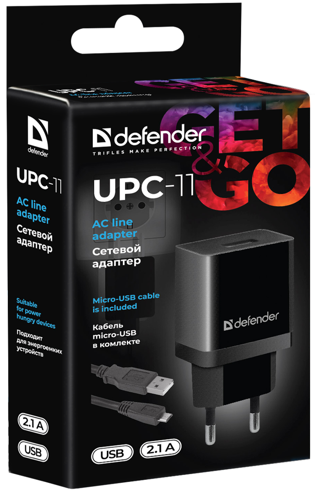 Зарядное устройство 220В USB-MicroUSB Defender UPC-11 2.1А чёрный (1/50)