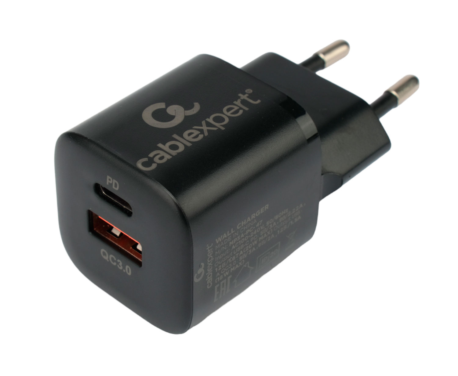Адаптер 220В USB+TypeC Cablexpert PC-47 20Вт, быстрая зарядка, QC3.0/PD чёрный, пакет (1/200)