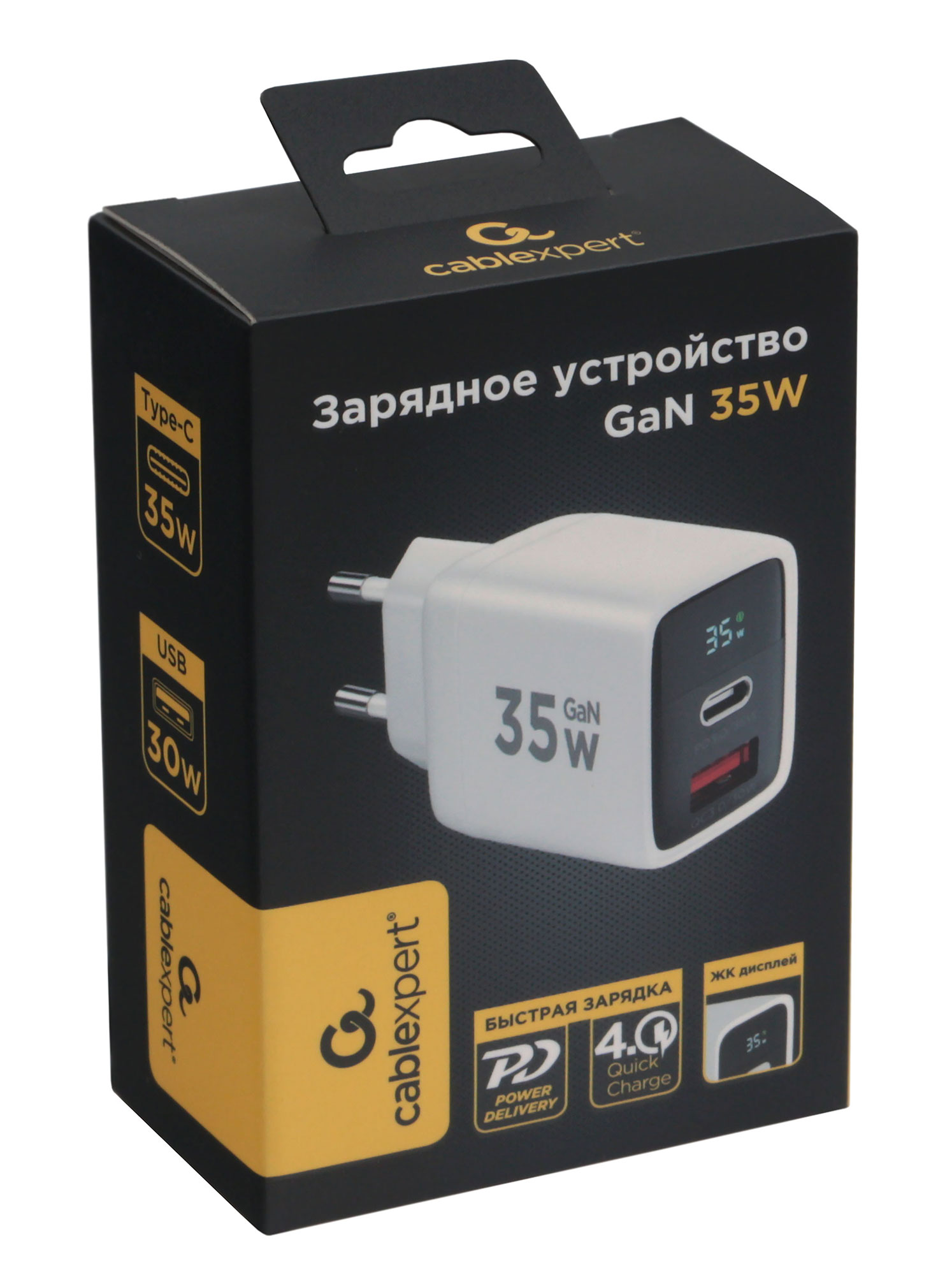 Адаптер 220В USB+TypeC QC4.0/PD3.0 Cablexpert PC-52, с ЖК-дисплеем, 3A, 35Вт GaN, белый, коробка (1/100)