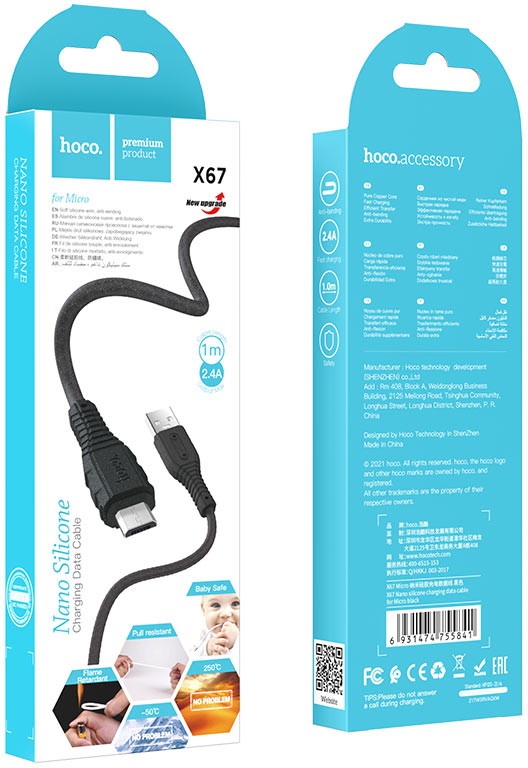 Кабель USB-microB 1м Hoco X67 2.4A силикон чёрный коробка (1/31/310)