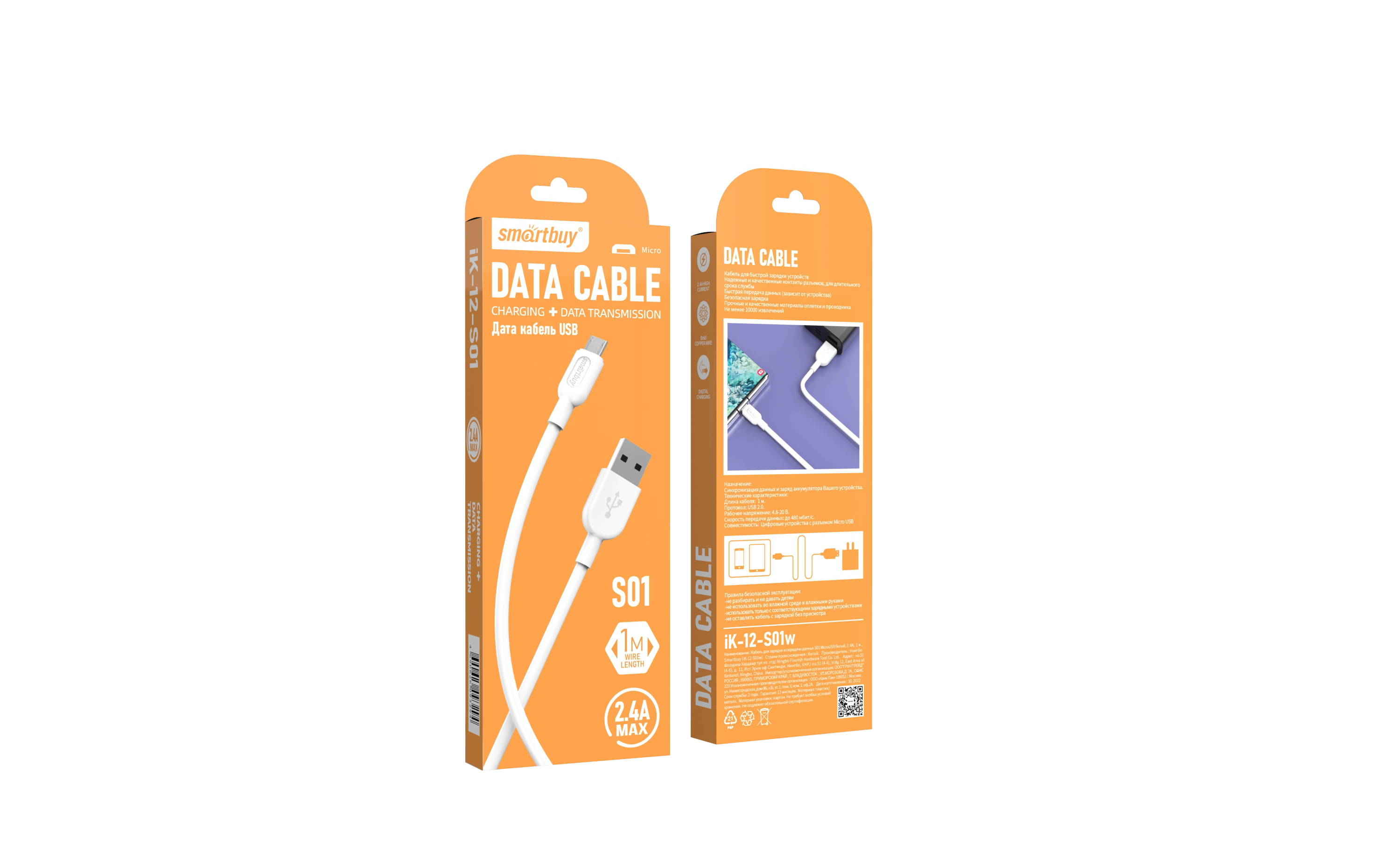 Кабель USB-microB 1м SmartBuy S01 2.4A белый коробка (1/50)