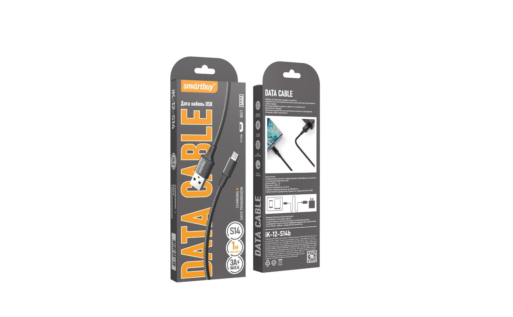 Кабель USB-microB 1м SmartBuy S14 3A чёрный коробка (1/50)