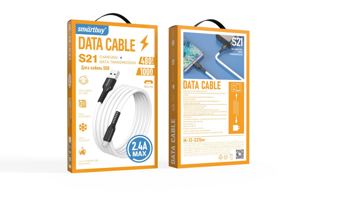 Кабель USB-microB 1м SmartBuy S21 2.4A силиконовый белый коробка (1/50)