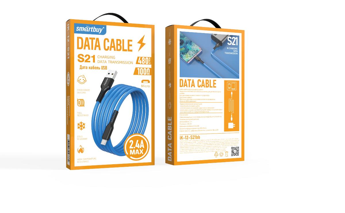 Кабель USB-microB 1м SmartBuy S21 2.4A силиконовый синий коробка (1/50)