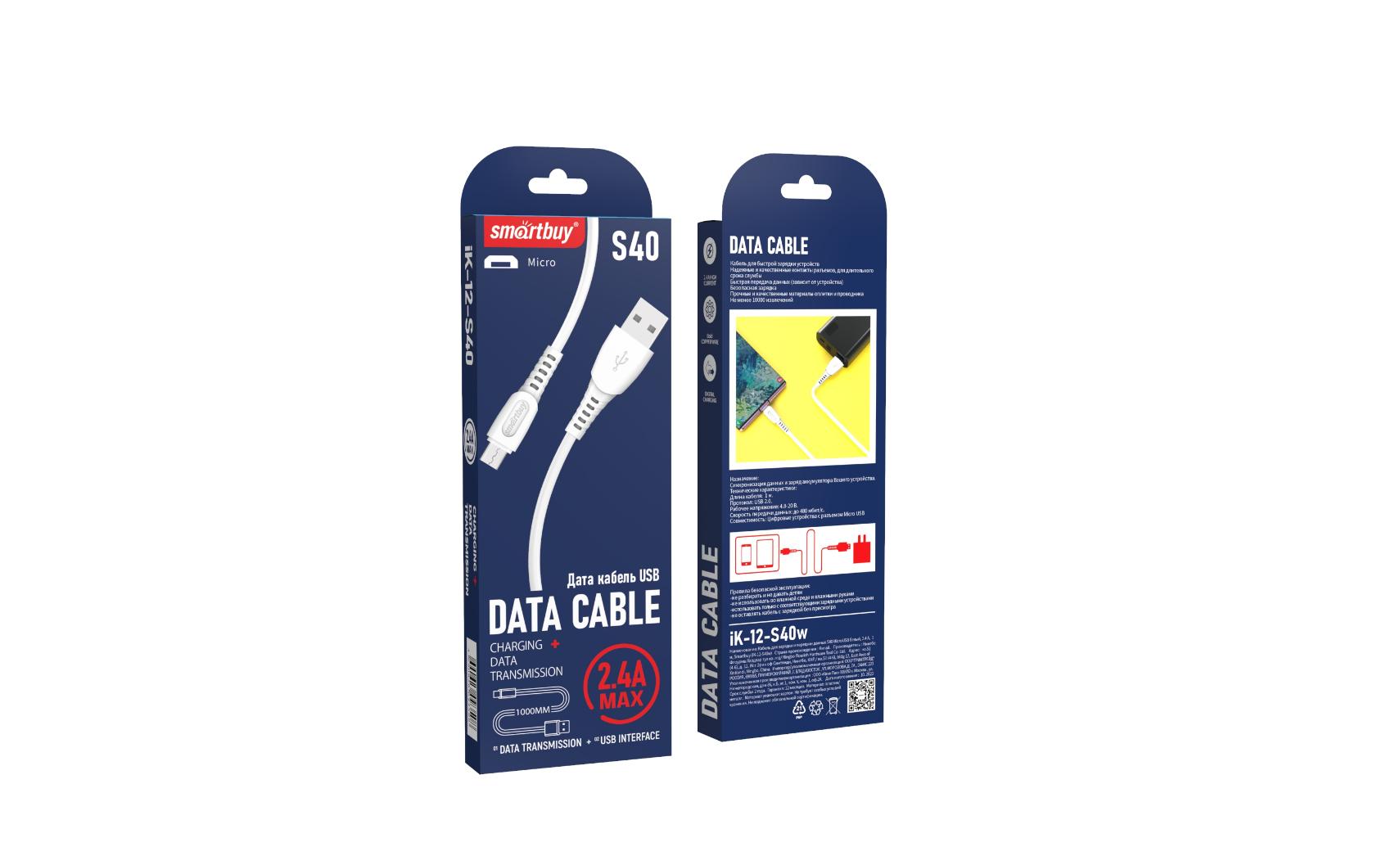 Кабель USB-microB 1м SmartBuy S40 2.4A белый коробка (1/50)