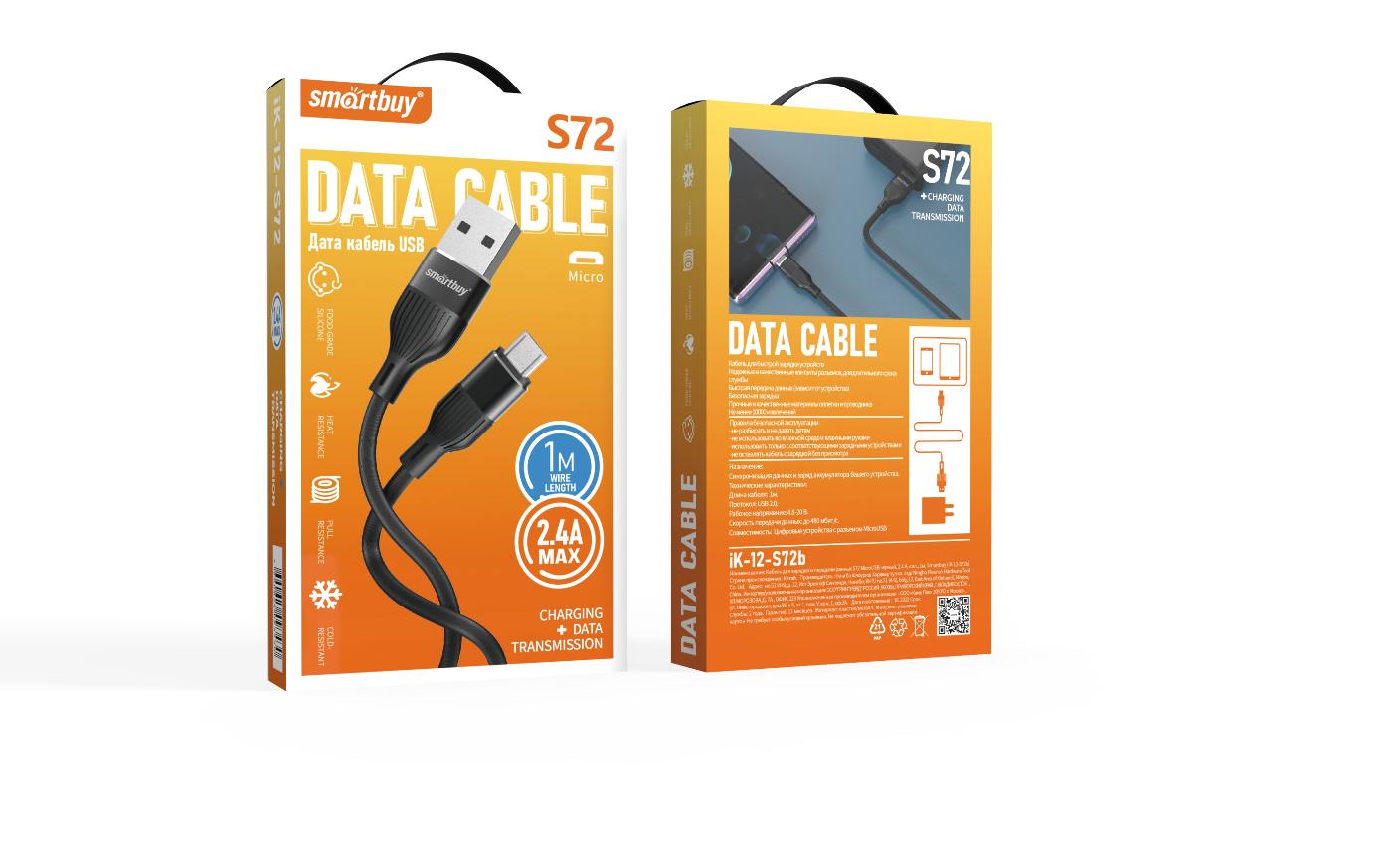 Кабель USB-microB 1м SmartBuy S72 2.4A силиконовый чёрный коробка (1/50)