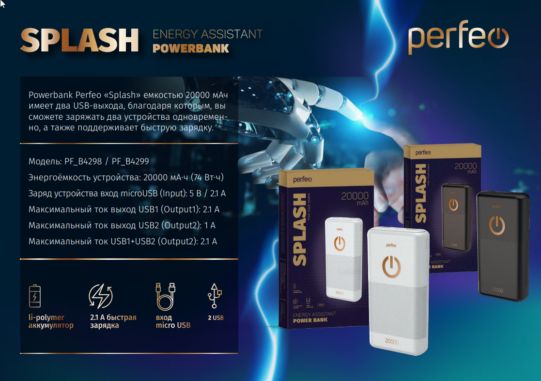Интернет-магазин «Витрина 59» предлагает купить товар «Мобильный аккумулятор (powerbank) 20000мАч Perfeo Splash 2*USB:2.1А черный» по цене: 109 091.00 руб. Артикул товара - PF_B4298. Вы можете оформить заказ через интернет-магазин или по телефону +7 (950) 45-67-67-6. Дополнительную информацию о продаже товаров из каталога «Бытовая техника, аксессуары для сотовых» вы можете получить у нашего менеджера. Звоните!