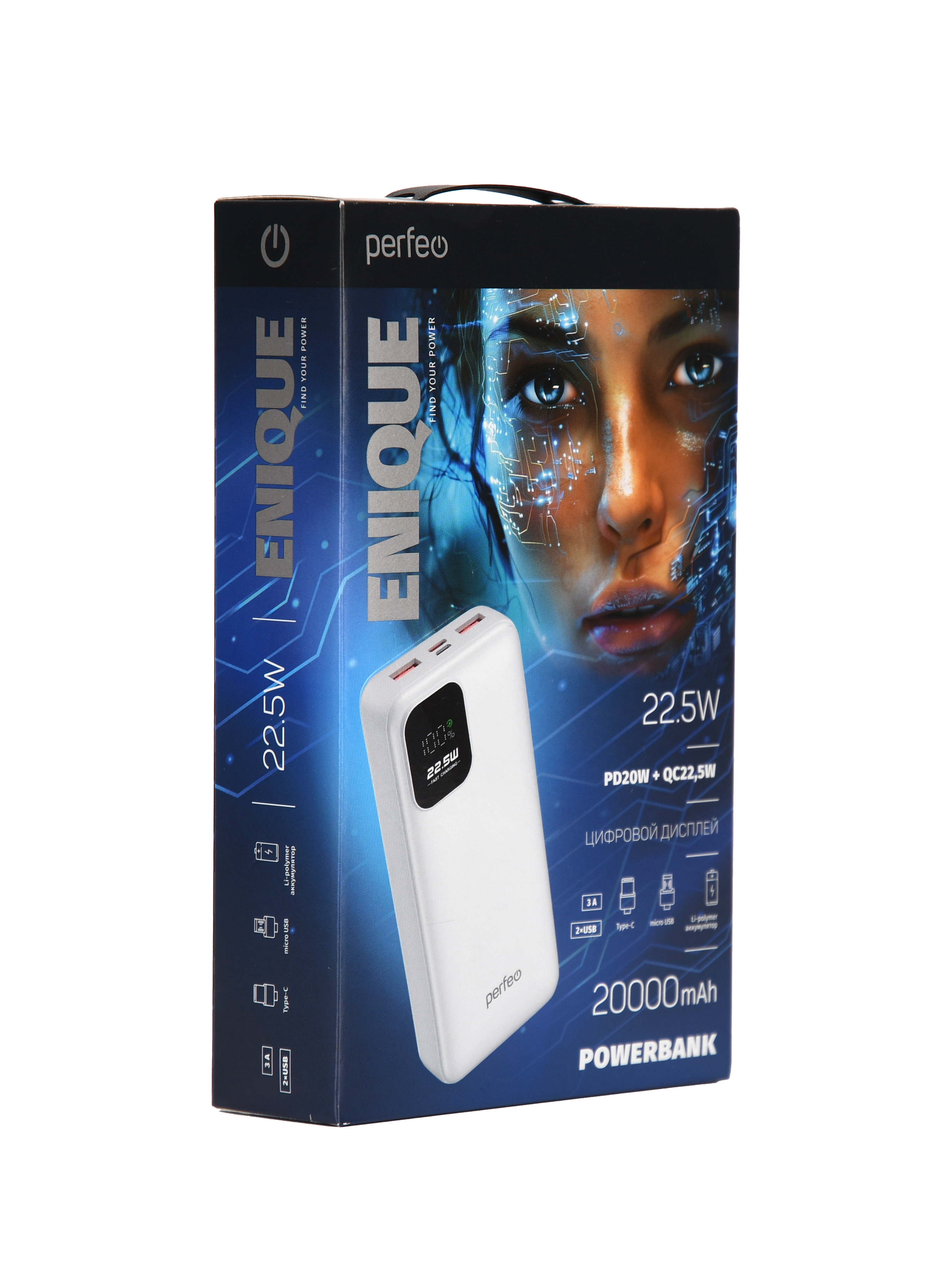 Мобильный аккумулятор (powerbank) 20000мАч Perfeo UNIQUE PD+QC 3.0/Type-C/2 USB/Выход: 5A, max 22.5W/LED-дисплей белый (1/10)