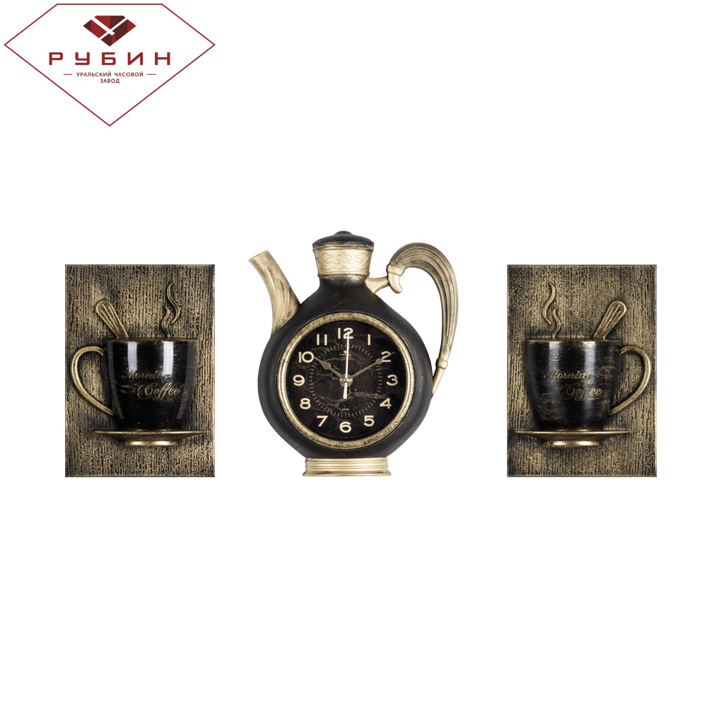 Часы настенные Рубин чайник пластик 26,5*24+ 2 чашки "Gold" корпус черный с золотом (1/5)
