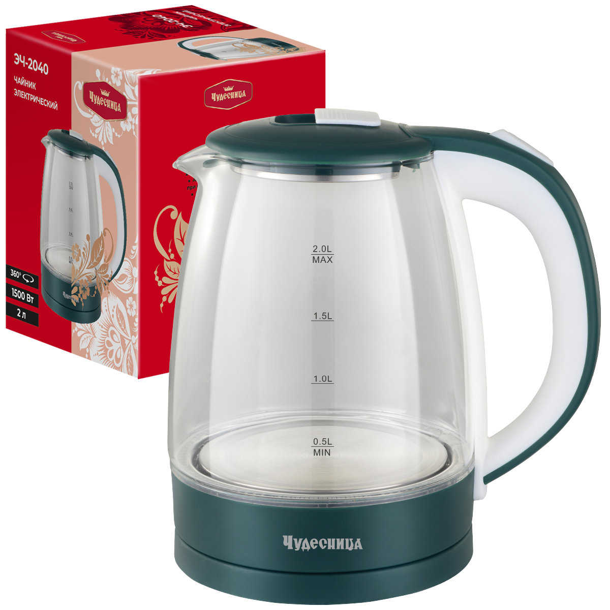 Чайник электрический стекло Чудесница ЭЧ-2040, 2л, 1500Вт, LED-подсветка, зелёный/белый (1/12)