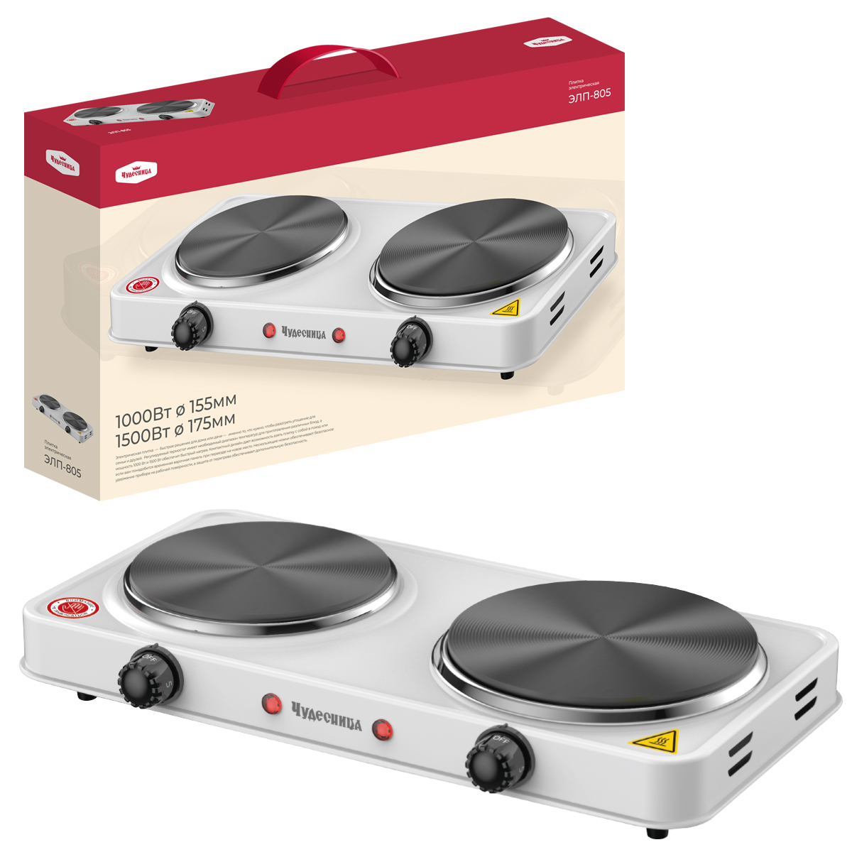 Электроплитка 2 конфорки Чудесница ЭЛП-805 1000+1500Вт диск чугун d155+175мм белый (1/6)