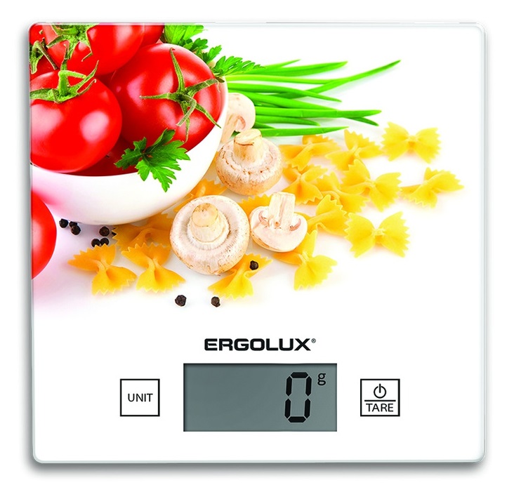 Весы кухонные электронные Ergolux ELX-SK01-С36 5кг 150х150мм CR2032 паста,томаты и грибы (20)