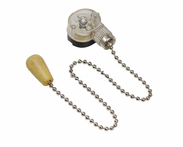 Выключатель для настенного светильника с хромированной цепочкой и деревянным наконечником.