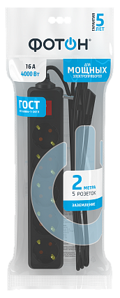 Удлинитель 5гн 2м с заземлением выключатель 4000Вт 3x1мм2 Фотон 16-25ЕS черный (20)