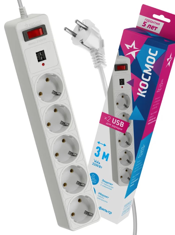 Сетевой фильтр Космос 5гнёзд 3м 2хUSB/2.1A ПВС 2200Вт 3x0.75мм² белый (20)