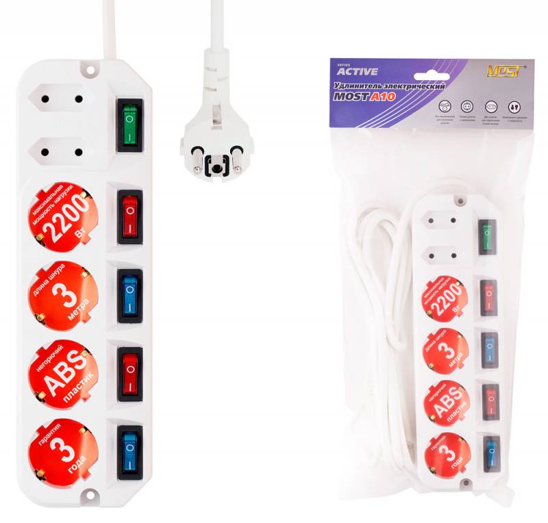 Сетевой фильтр Most A10 6гнезд 1,6м 2200Вт,отдельные выключатели, белый