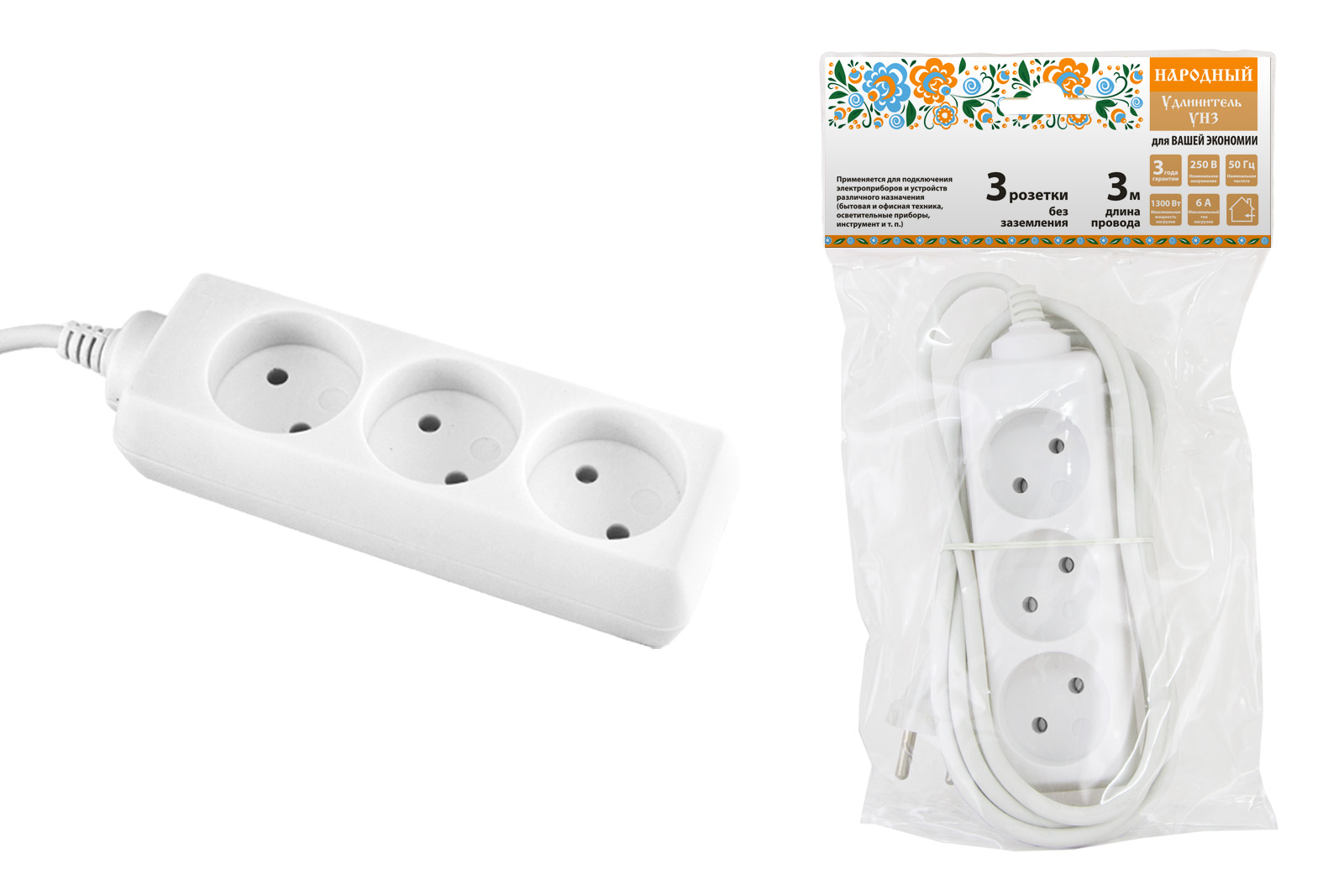 Удлинитель 3гн 3м без заземления ШВВП 1380Вт 2x0.75мм² НАРОДНЫЙ (54)
