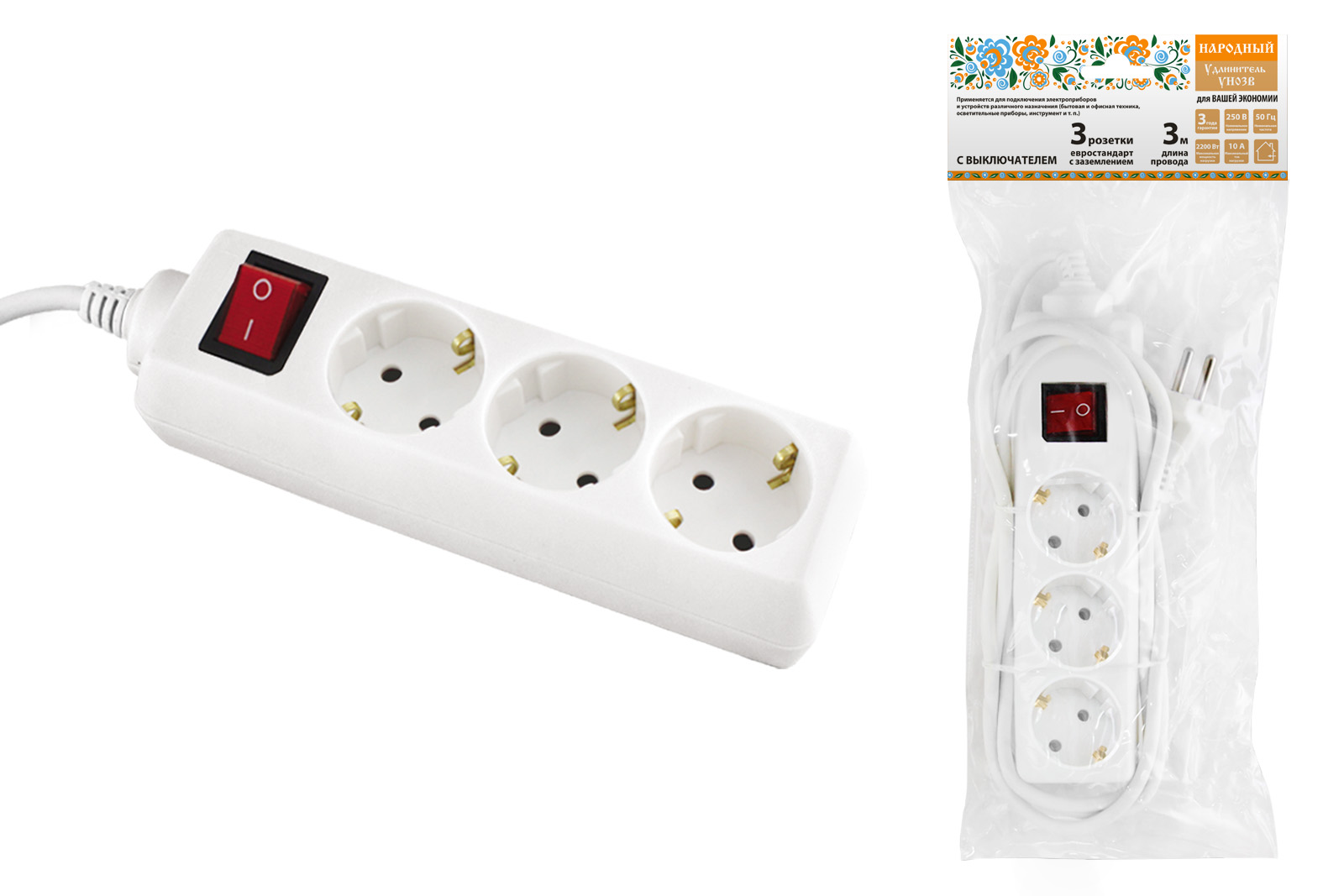 Удлинитель 3гн 3м с заземлением выключатель ПВС 2300Вт 3x0.75мм² НАРОДНЫЙ (36)