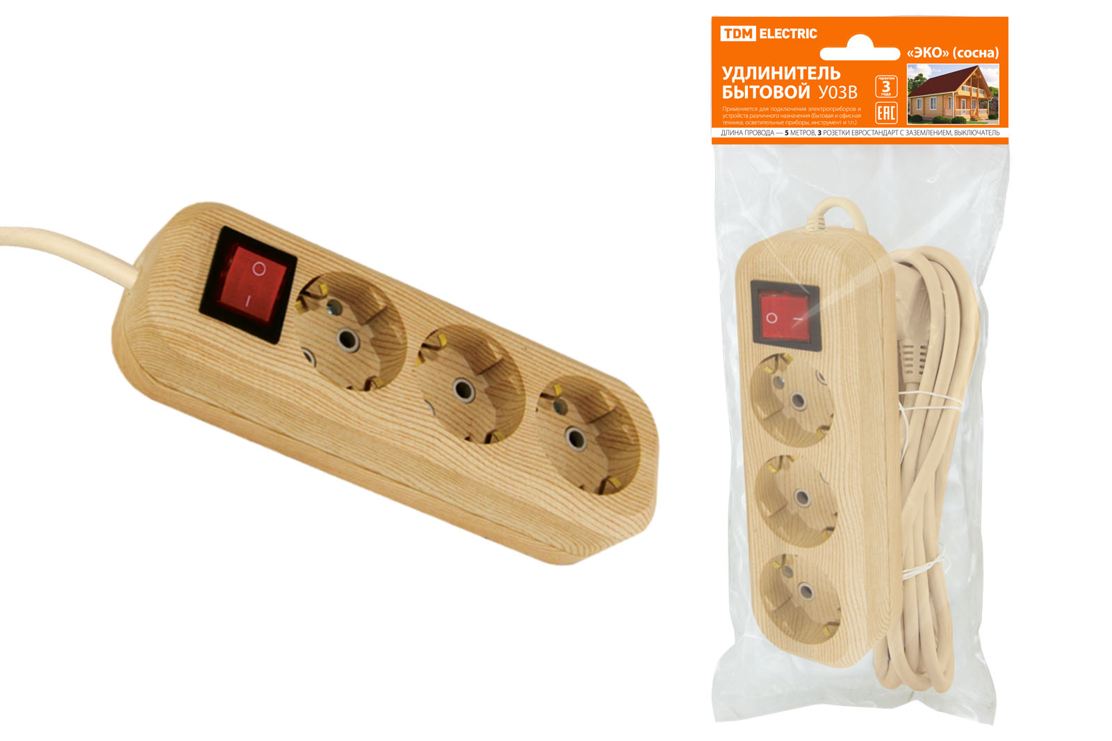 Удлинитель 3гнезда 5м с заземлением выключатель ПВС 3500Вт 3x1мм² TDM Сосна У03В (10)