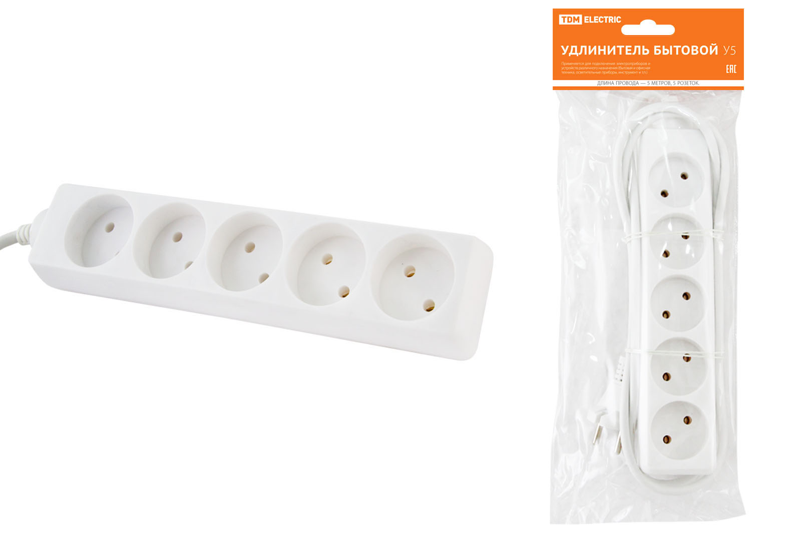 Удлинитель 5гнёзд 5м без заземления ПВС 1300Вт 2x0.75мм² TDM (20)