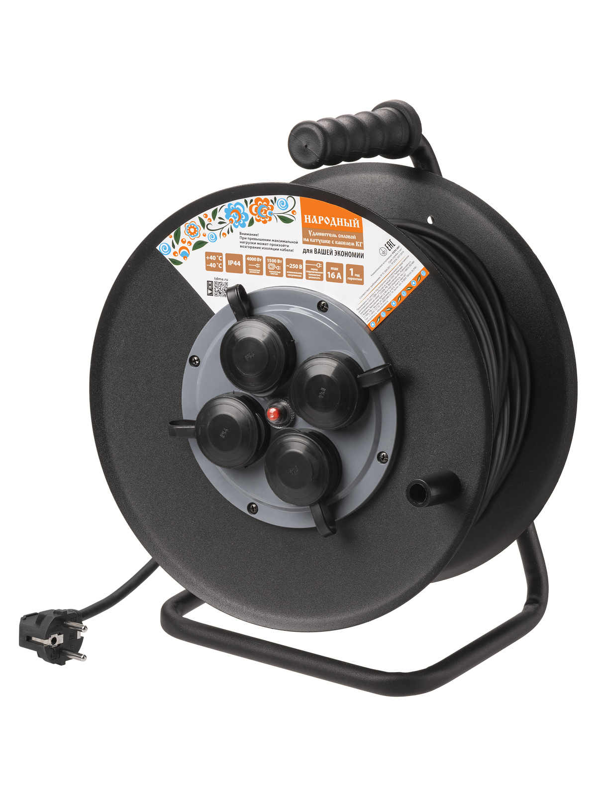 Удлинитель-катушка 4гн 50м с заземлением КГ 4000Вт 3x2.5мм² IP44 TDM Народный