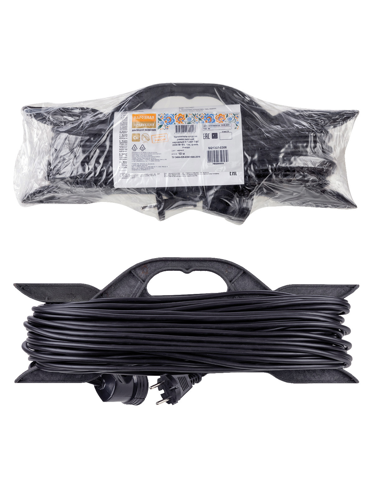 Удлинитель-рамка 1гн 10м без заземления ПВС 2200Вт 2x1мм² TDM Народный (10)