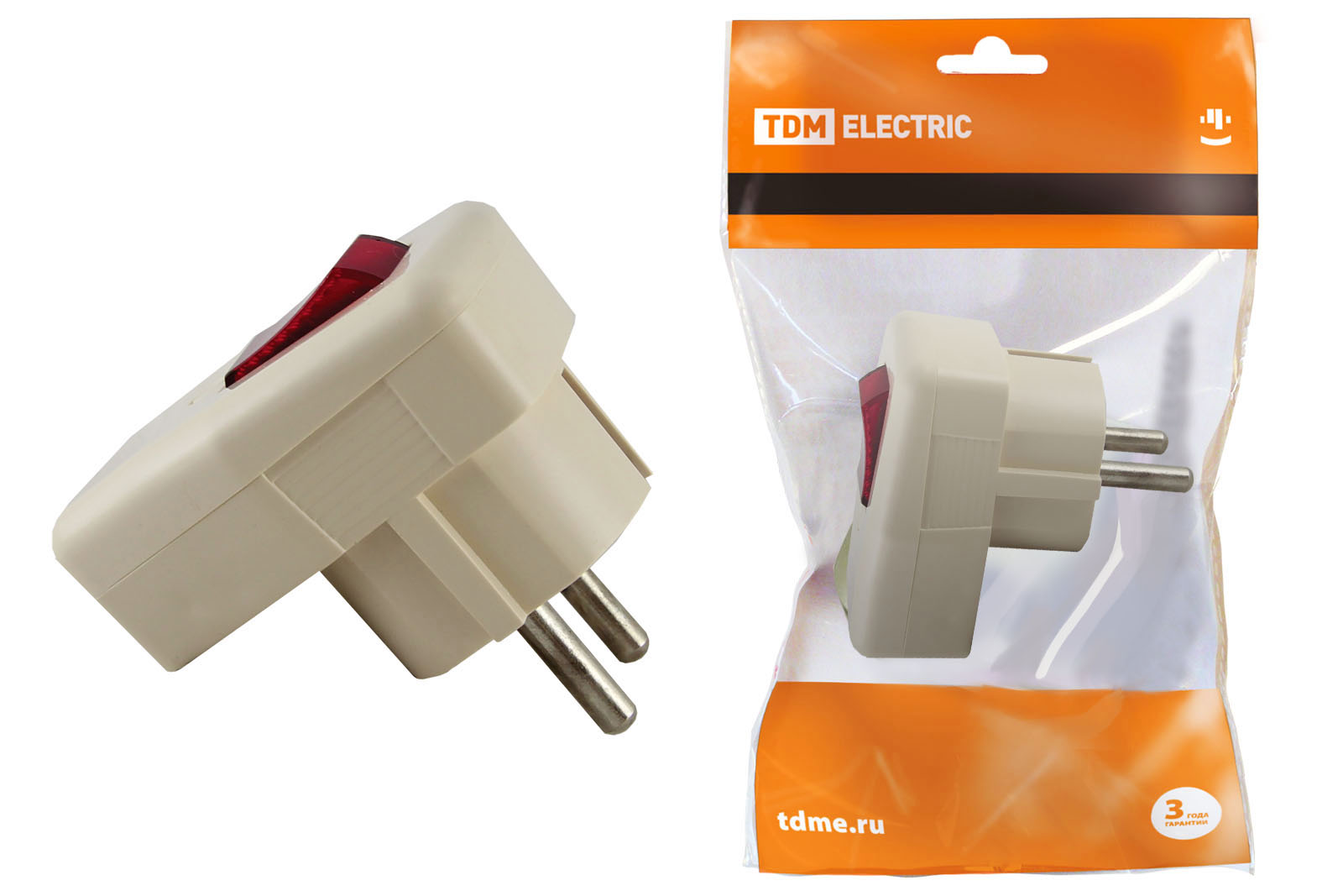 Вилка TDM угловая с заземлением выключатель белая/крем (480)