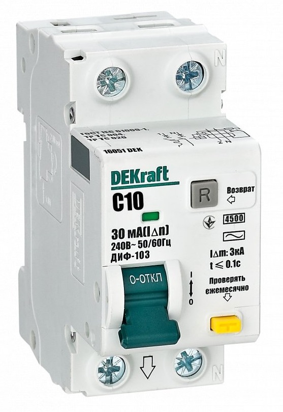 ДИФ 1Р+N 10А 30мА АС 4,5кА С DEKraft ДИФ-103 (6)