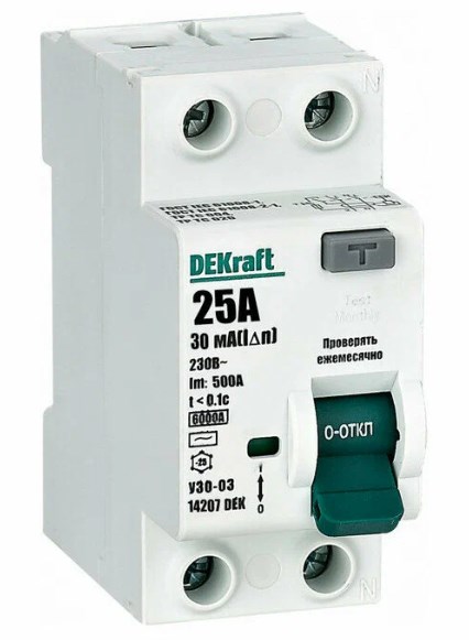 Выключатель дифференциального тока серии УЗО-03 DEKraft; 2P; номинальный ток 25 А; ном.дифф. ток 30 мА; электромеханический; тип дифференциального расцепителя - AC; на DIN-рейку. ВДТ устанавливаются в сетях напряжением до 400 В пер.тока. ВДТ применяются для защиты электроустановок от риска возникновения пожаров вследствие утечек тока. Конструкция устройств позволяет эксплуатировать их даже при низкой температуре. При сборке выключатель дифференциального тока (ВДТ) и автоматический выключатель (для защиты ВДТ) устанавливаются последовательно, при этом номинальный ток аппарата должен быть на одну ступень выше — т. е. 20А при установке последовательно с автоматом на 16А, 32А при установке с автоматом на 25А.