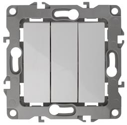 Выключатель 3-клавишный серии Эра 12 скрытой установки механизм цвет белый 12-1107-01. Номинальные характеристики 10А 250В . Сделан из поликарбоната, оснащён винтовыми уникальными клеммами ЭКСПЕРТ для надёжной фиксации жил кабеля в механиме. Парные клеммы обеспечивают соединение шлейфом. Монтаж в подрозетник производится и на лапки, и на винты. Рамки приобретаются отдельно. Рамки Эра 12: 1 пост 12-5001-хх, 2 поста 12-5002-хх, 3 поста 12-5003-хх, 4 поста 12-5004-хх, 5 постов 12-5005-хх. Рамки Эра 12 Сатин: 1 пост 12-5101-хх, 2 поста 12-5102-хх, 3 поста 12-5103-хх, 4 поста 12-5104-хх, 5 постов - 12-5105-хх (хх - код цвета: 01-белый, 02-слоновая кость, 03-алюминий, 04-шампань, 05-антрацит, 06-чёрный, 07-ольха(белёный дуб-сатин), 08-вишня, 09-дуб, 10-венге, 11-сосна, 21-жёлтый, 22-оранжевый, 23-красный, 24-охра, 25-бордо, 26-лайм, 27-зелёный, 28-голубой, 29-синий).