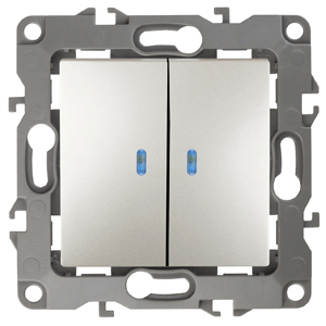 Выключатель 2-клавишный с подсветкой серии Эра 12 скрыт.установки механизм цвет перламутр 12-1105-15. Номинальные характеристики 10А 250В . Сделан из поликарбоната, оснащёно автоматическими клеммами для быстрй и надёжной фиксации жил кабеля в механиме. Парные клеммы обеспечивают соединение шлейфом. Монтаж в подрозетник производится и на лапки, и на винты. Рамки приобретаются отдельно. Рамки Эра 12: 1 пост 12-5001-хх, 2 поста 12-5002-хх, 3 поста 12-5003-хх, 4 поста 12-5004-хх, 5 постов 12-5005-хх. Рамки Эра 12 Сатин: 1 пост 12-5101-хх, 2 поста 12-5102-хх, 3 поста 12-5103-хх, 4 поста 12-5104-хх, 5 постов - 12-5105-хх (хх - код цвета: 01-белый, 02-слоновая кость, 03-алюминий, 04-шампань, 05-антрацит, 06-чёрный, 07-ольха(белёный дуб-сатин), 08-вишня, 09-дуб, 10-венге, 11-сосна, 21-жёлтый, 22-оранжевый, 23-красный, 24-охра, 25-бордо, 26-лайм, 27-зелёный, 28-голубой, 29-синий).