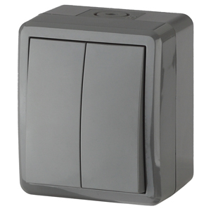 Выключатель влагозащищённый IP54 2-клавишный серии Эра Эксперт открытой уст. цвет серый 11-1404-03. Номинальные характеристики . Выключатель выполнен из качественного поликарбоната, оснащён уникальными винтовыми клеммами ЭКСПЕРТ для максимально качественного зажима кабеля в механизме.