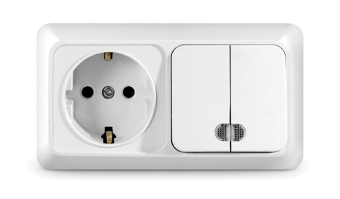 Блок Олимп горизонтальный 2кл. подсветка + розетка с/з белый (5/50)