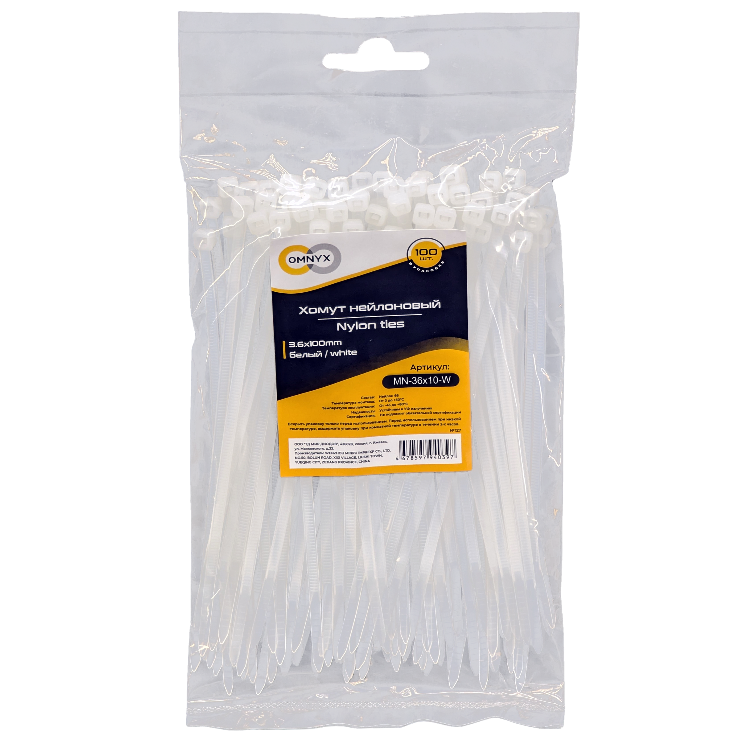 Хомут нейлоновый 3.6x100 белый 100шт Omnyx (300)