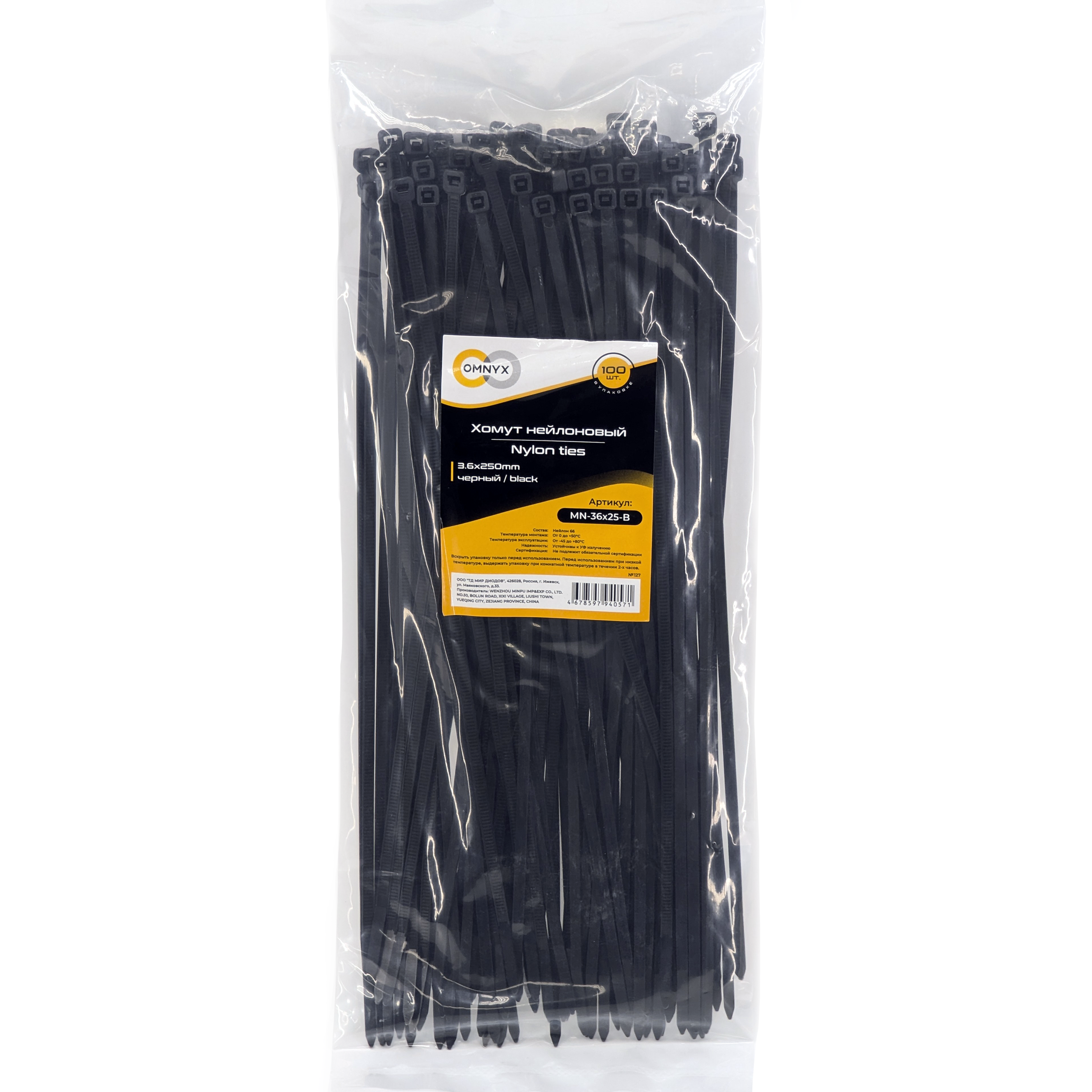 Хомут нейлоновый 3.6x250 черный 100шт Omnyx (170)