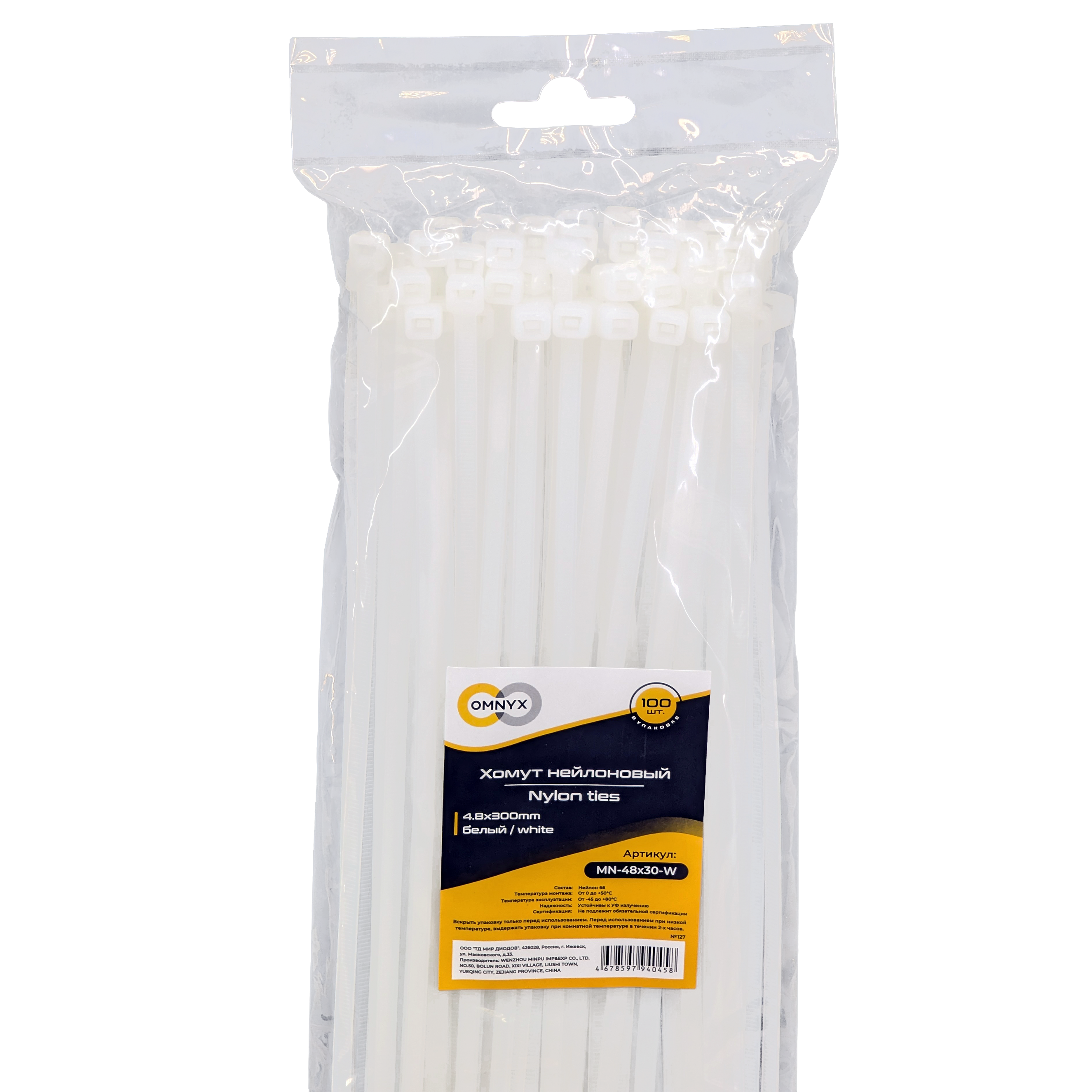 Хомут нейлоновый 4.8x300 белый 100шт Omnyx (100)