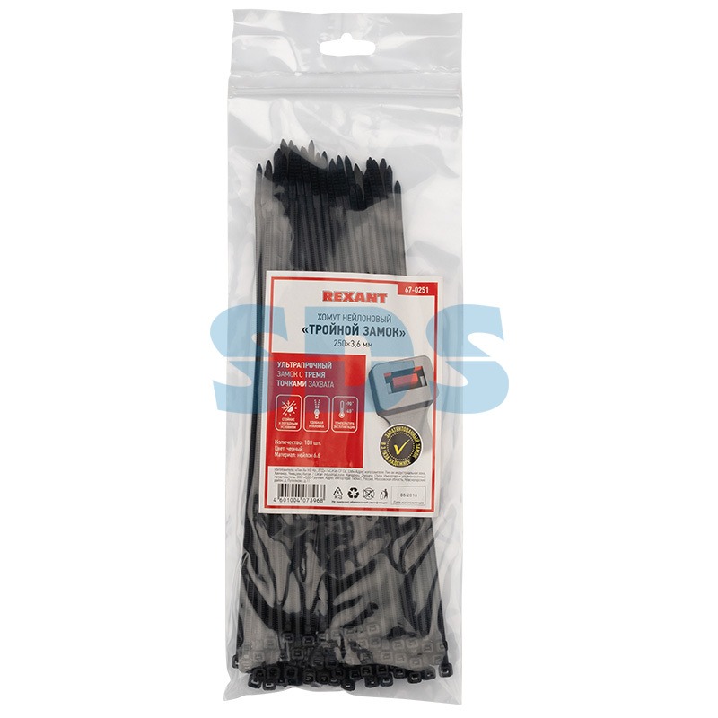 Хомут 3.6x250 черный тройной замок 100шт Rexant (10)