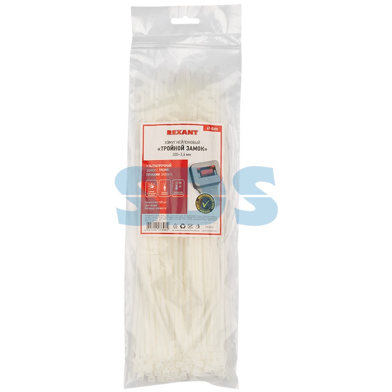 Хомут 3.6x300 белый тройной замок 100шт Rexant (10)