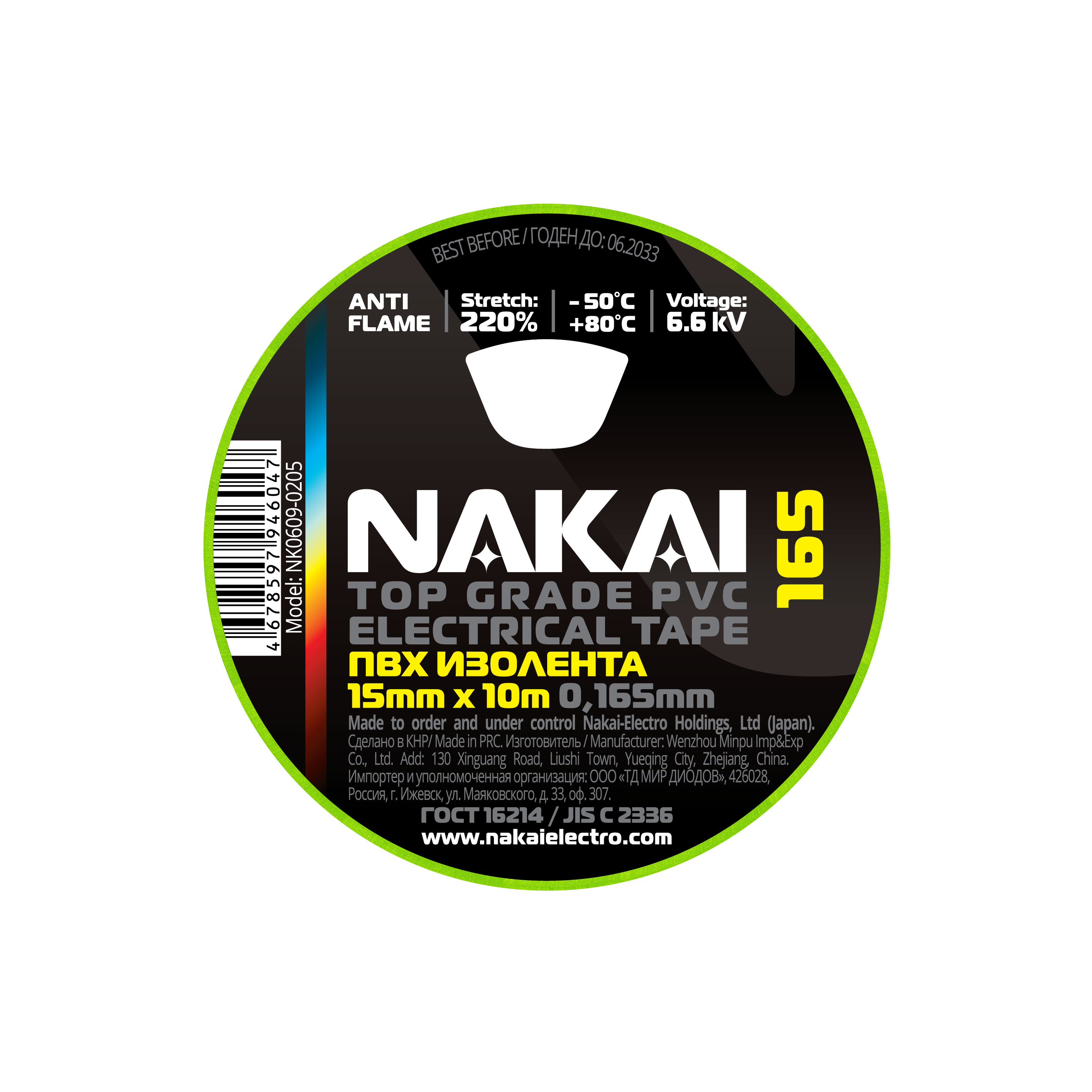 Изолента NAKAI 165 ПВХ 15мм х 10м зеленый (10/250)