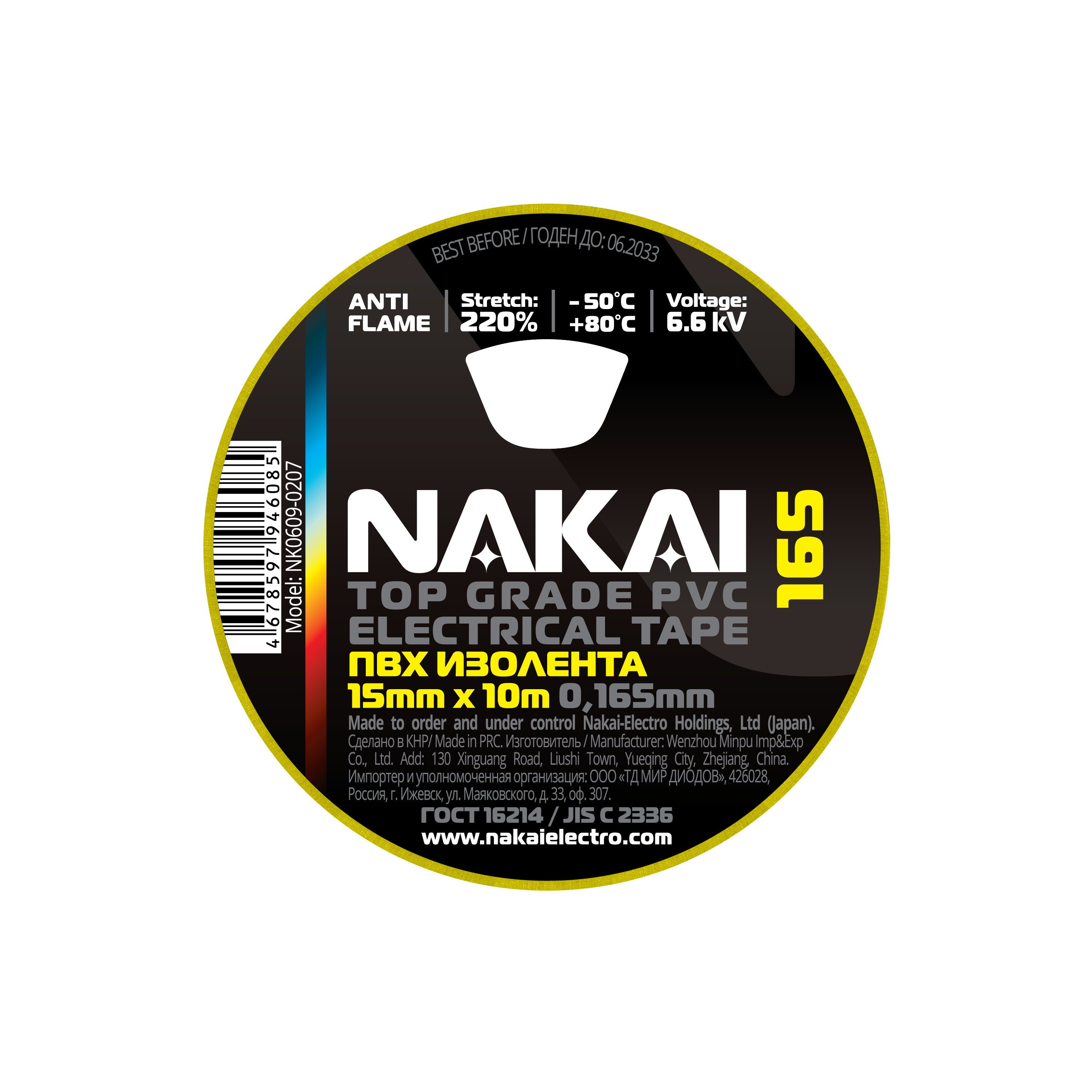 Изолента NAKAI 165 ПВХ 15мм х 10м желто-зеленый (10/250)
