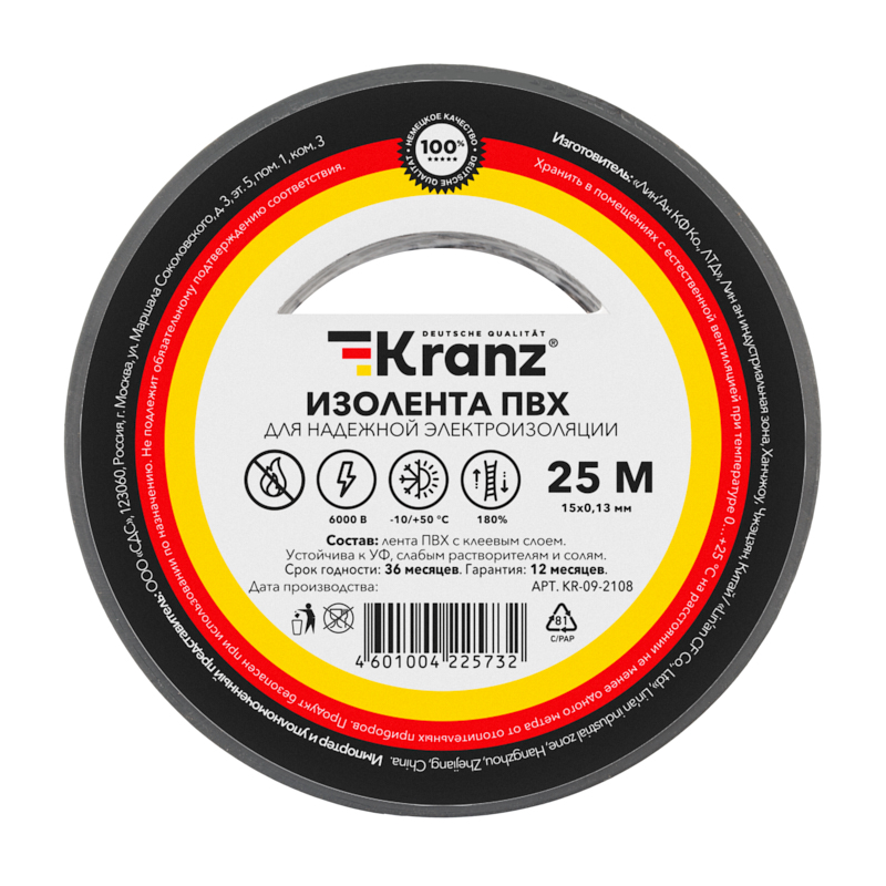 Изолента KRANZ предназначена для электрической изоляции, цветной маркировки, соединения, защиты от внешних факторов и герметизации кабелей, проводов и шнуров.