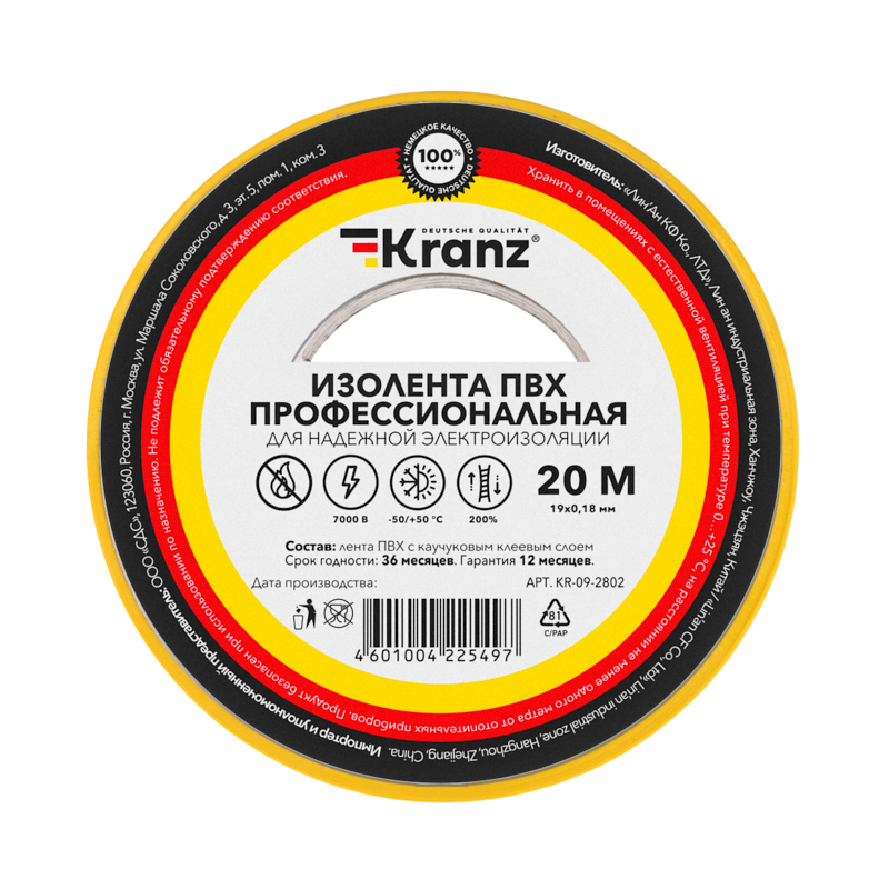 Изолента Kranz профессиональная 19мм х 20м желтый (10)
