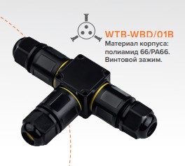 Соединитель кабеля тройник IP68 с/з Ø4-8.0/6-11мм сечение 0,5-2,5мм 128х86,5х25мм Wolta