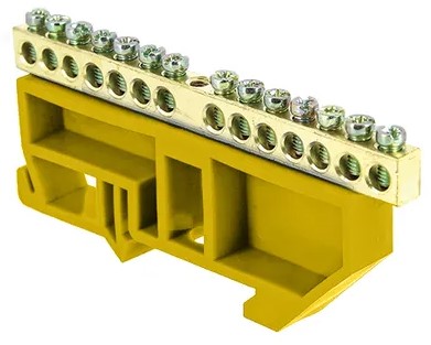 Шина PE (земля) изолятор на DIN-рейку 6x9мм 14 отверстий латунь желтый Omnyx (20/500)