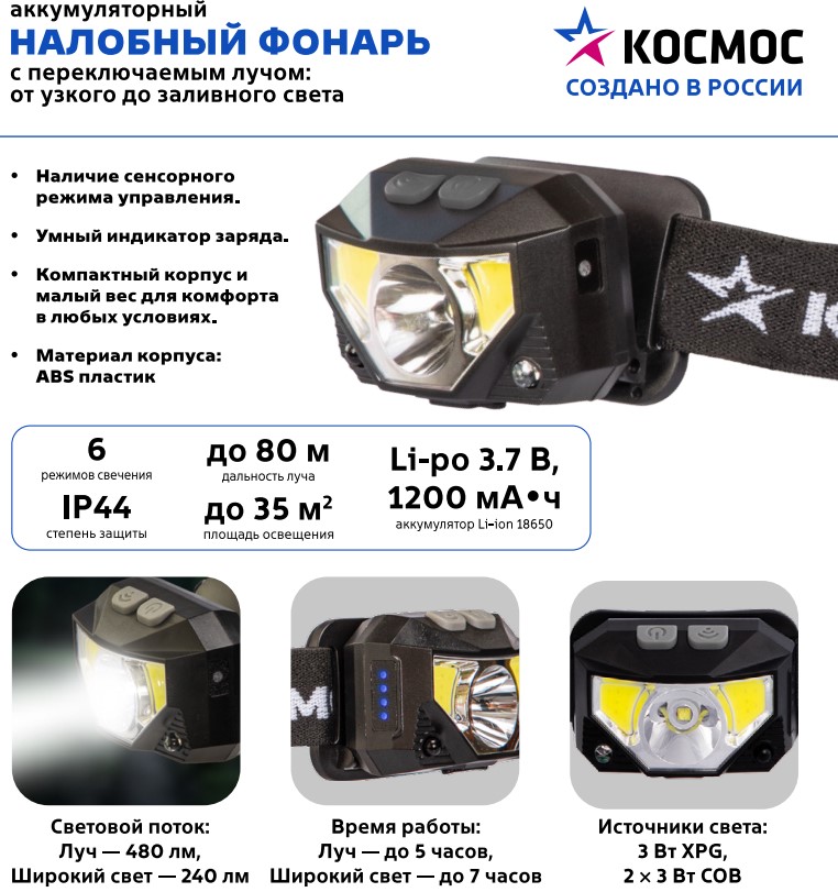 Фонарь налобный аккумуляторный Космос 851 3Вт+2х3Вт+красный сенсор 1200мАч (20/120)