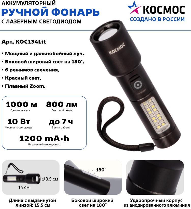Фонарь ручной аккумуляторный Космос 134 10+3ВтLED zoom 1000м 1200мAч (12)