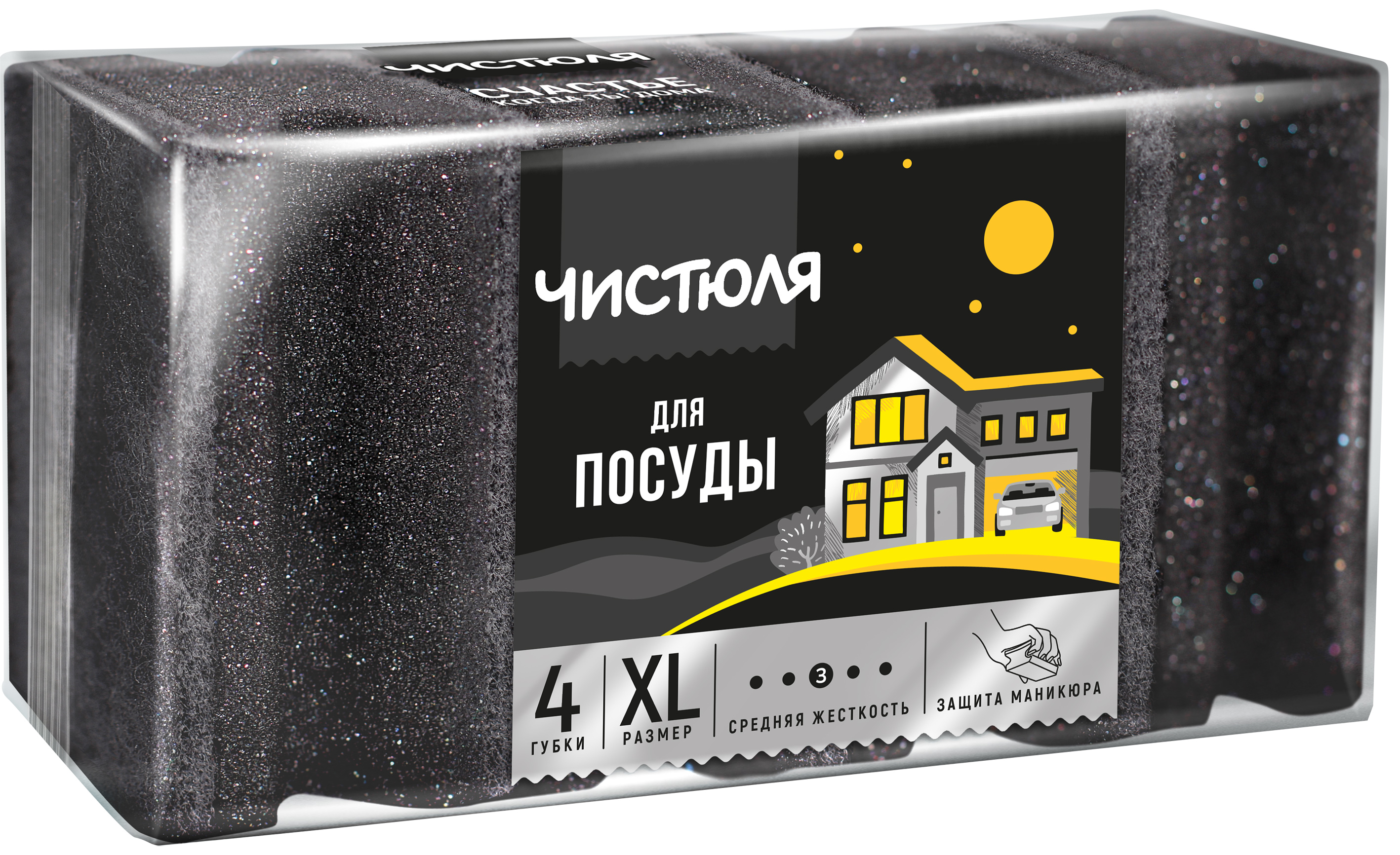 Губка для посуды 4XL 4шт Чистюля Защита маникюра черный (72)*